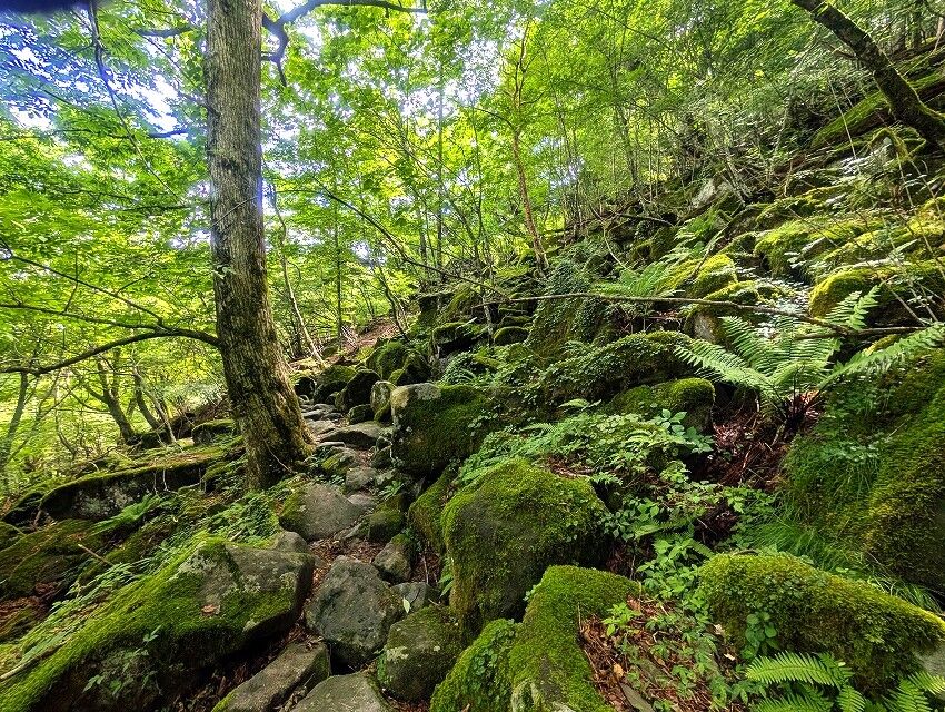 シオジ林付近までえっちらおっちらと登ってきたが! 倒木が登山道を塞いでいる、以前はなかった光景。