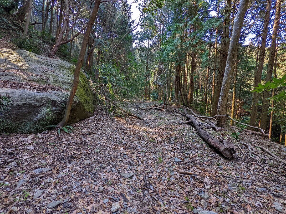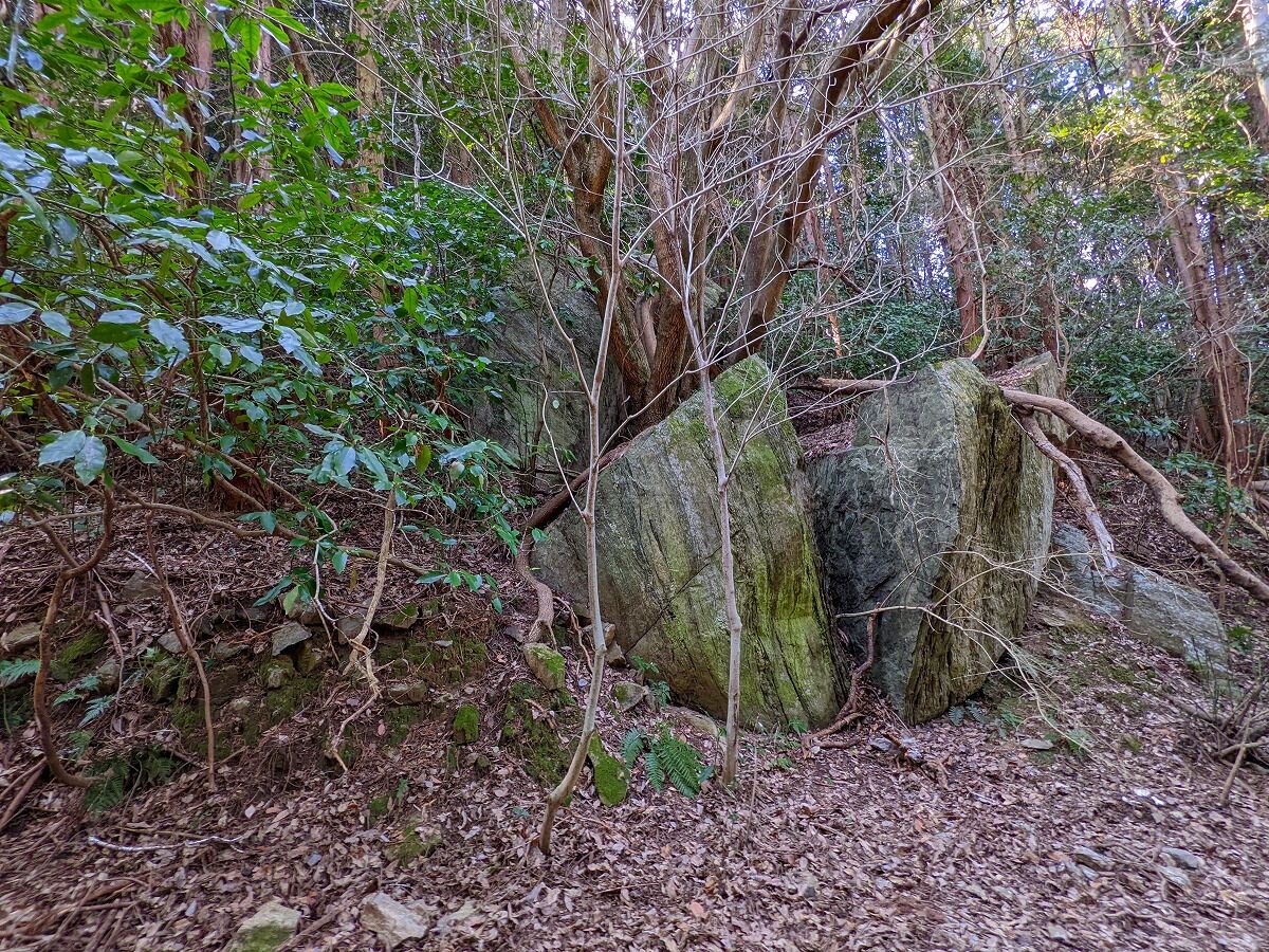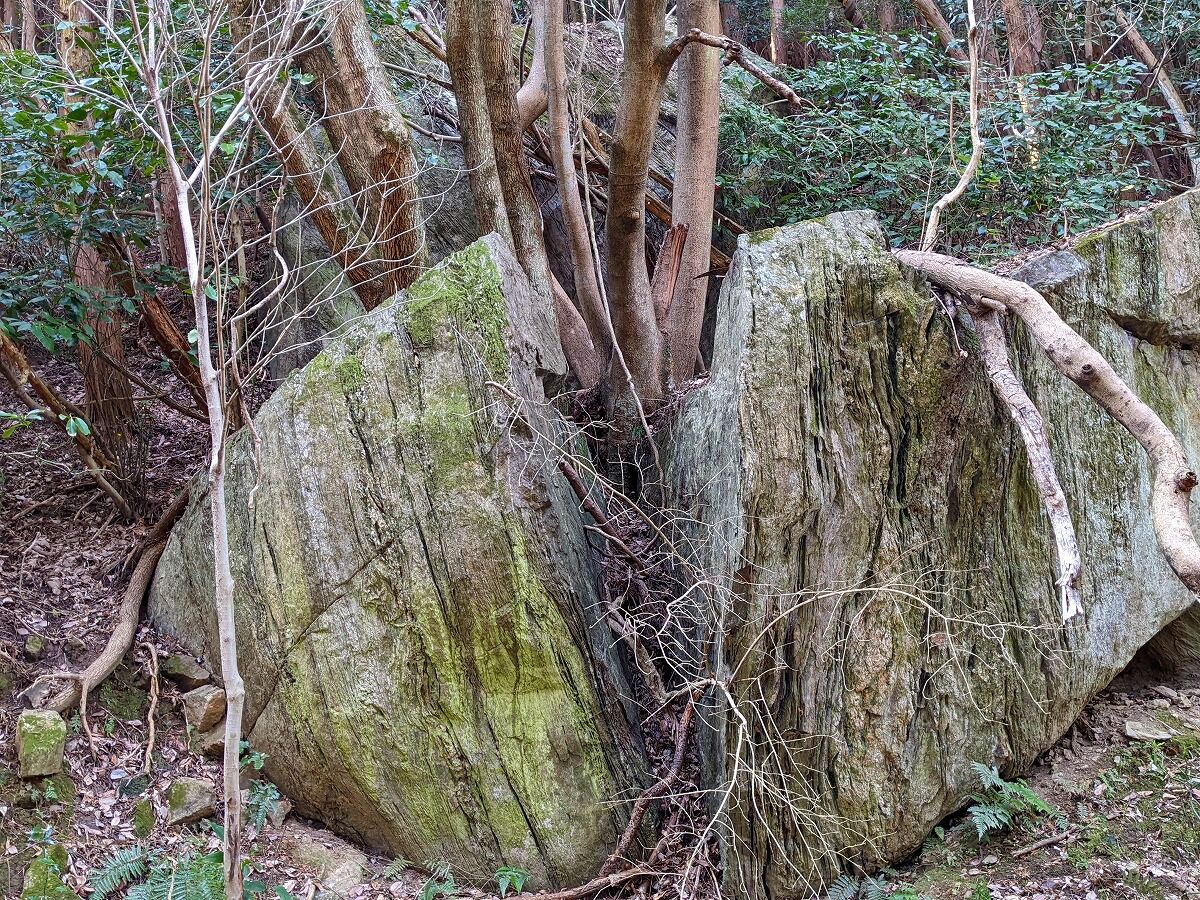 大きな岩魁がパックリと割れている、長年にわたり樹木の成長がこの巨岩を割ったのだろうか