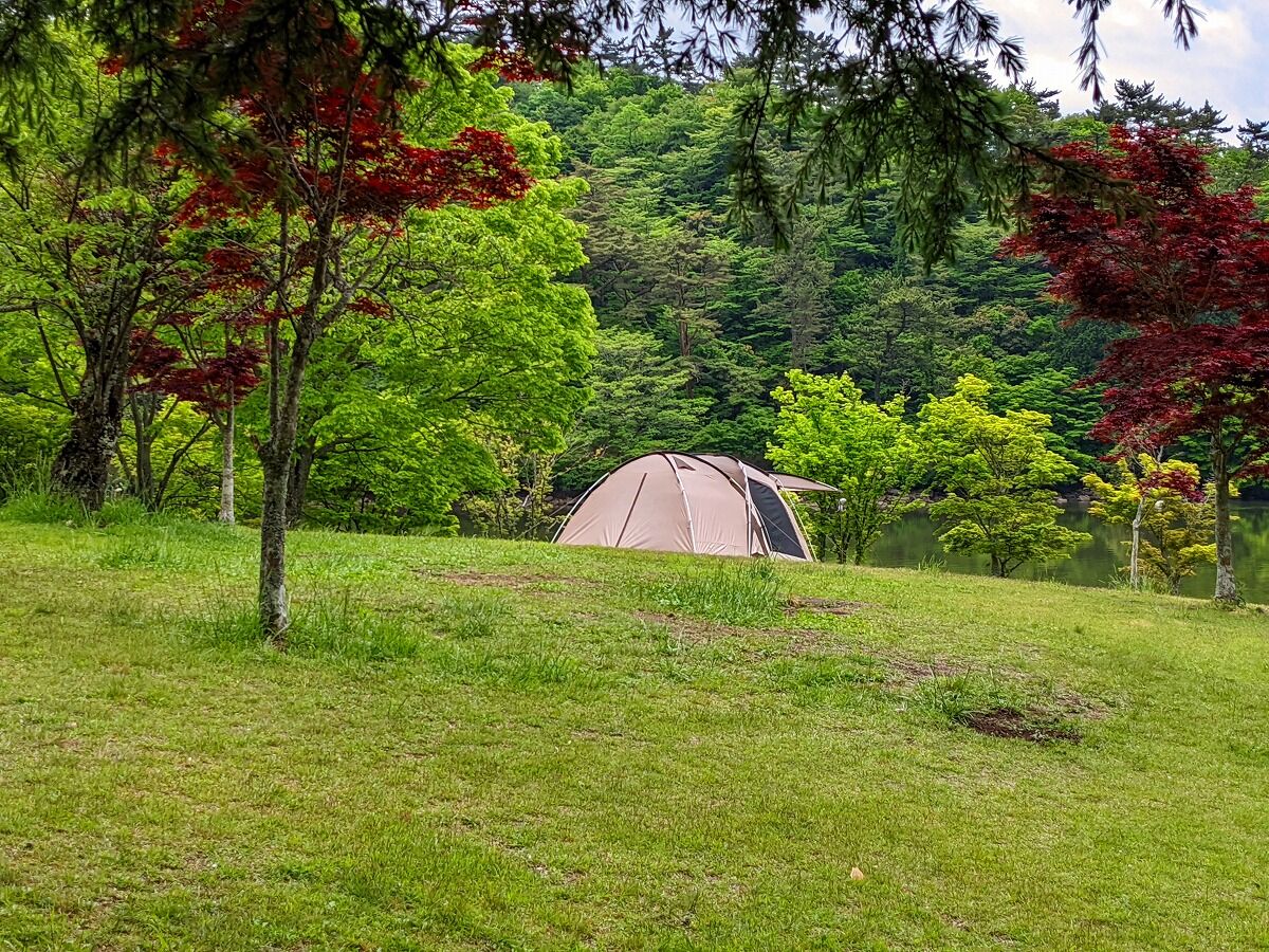 まずは 連休とあってここのキャンパーさん達は思い思いの場所にてテント張ってのんびりキャンプしています、ここはキャンプ用具は車に積んでそのままテント場まで乗り入れることができるとあって、大型テントがが乱立している。