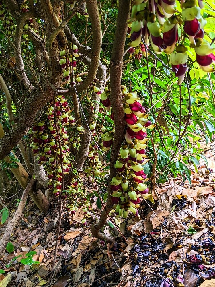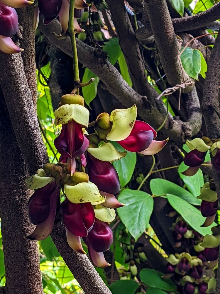 個人的にはこの植物の存在を知ってから十数年、いつかは見たいと念ずるもなかなかその機会に恵まれずようやく、やっとの思いが叶ったのでした、見るにつけ圧倒的な存在と頭上を覆いつくすような、咲きっぷり 南国ムード満点のカマエカズラ。いやはや見ごたえ充分すぎる存在感でした。調べるとこの地が北限のようです、オーナーさんはもう見ごろが過ぎ加減で申し訳なさそうなお話しでしたが いやいや、なんのその これだけの花を見させていただき最高でした