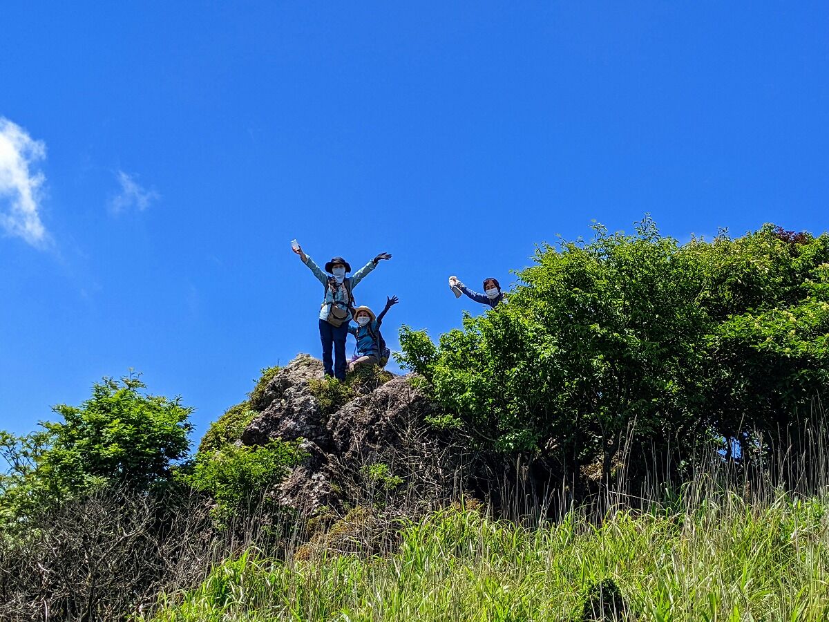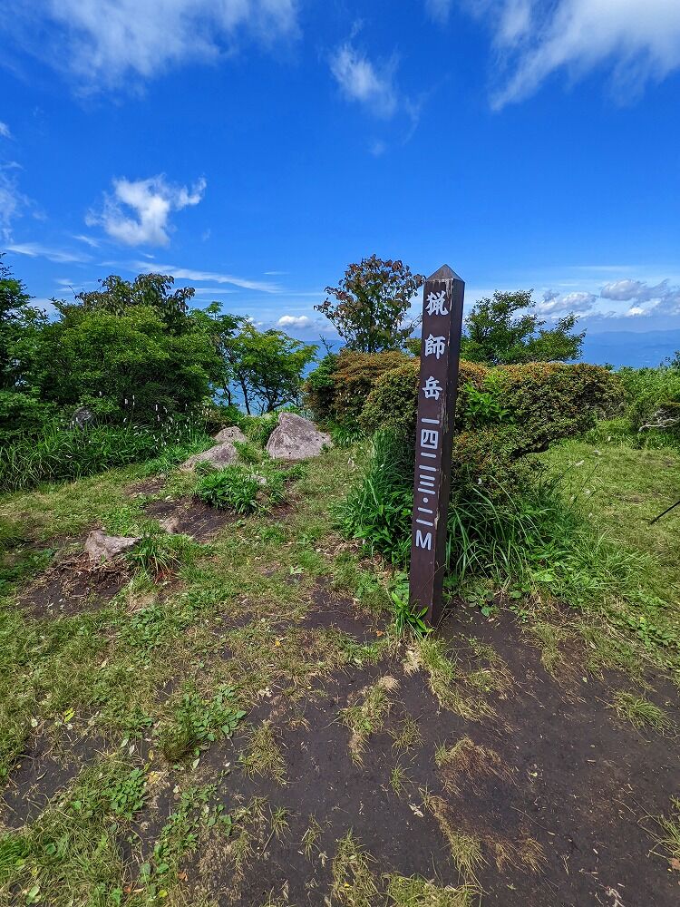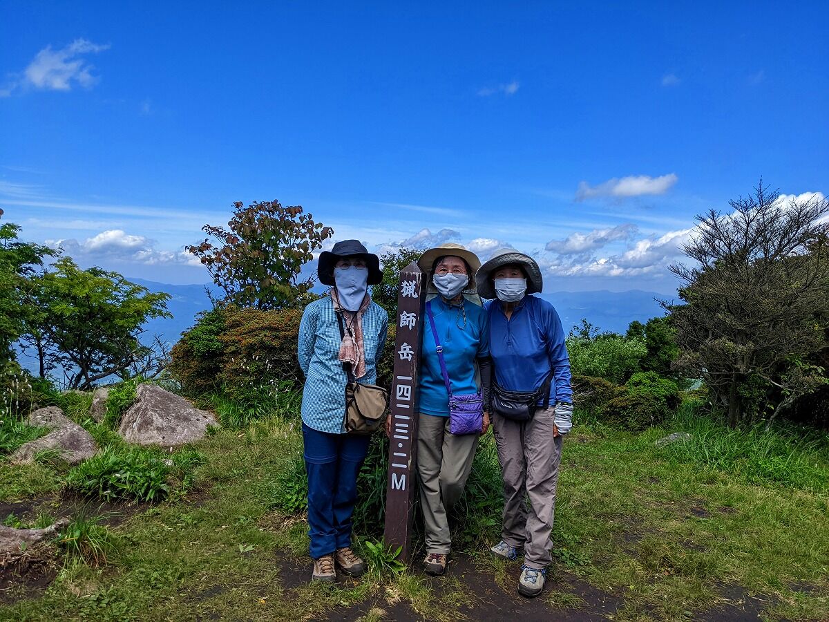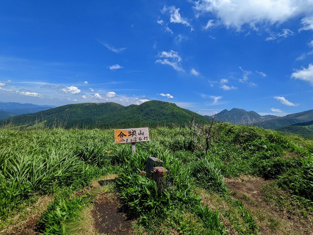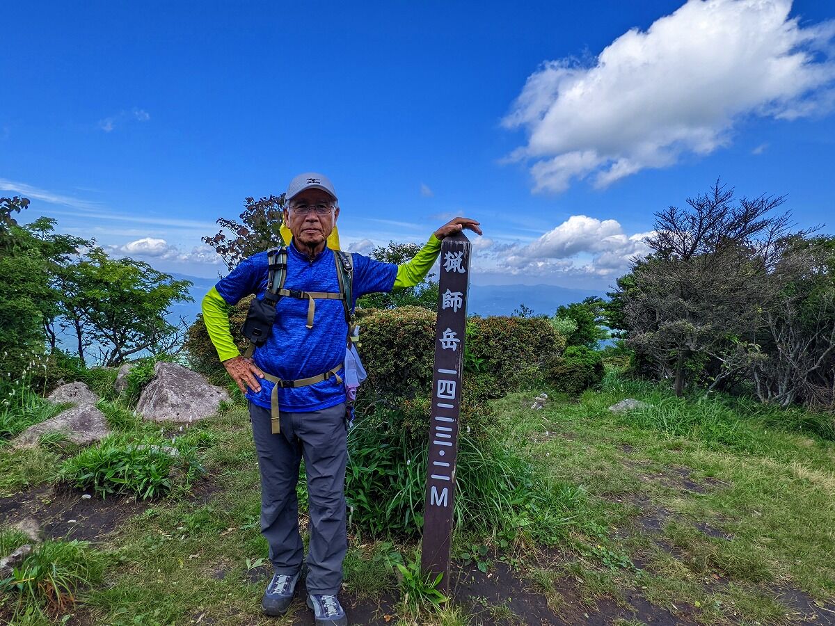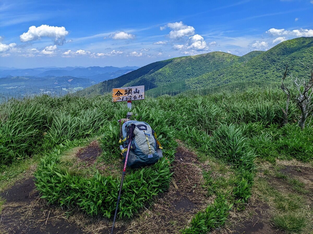 既に花期は終わった、ミヤマキリシマの群落帯をかき分けて登れば 山頂到着。登山前から不安だった膝の調子もここまでは、完全ではないものの、問題なく歩けた、山頂にて長々の休憩をしたら、これから合頭山までの稜線の比較的高低差のない、ルートになるので、このまま皆さんと一緒の行動をすることになった、