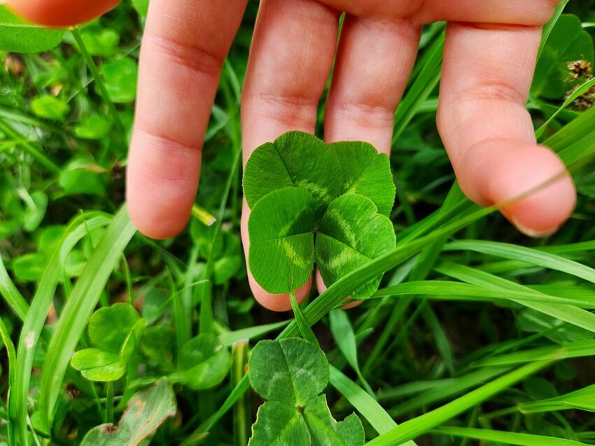 Kちゃんが 四葉のクローバを見つけたり 花を見たり楽しそうです