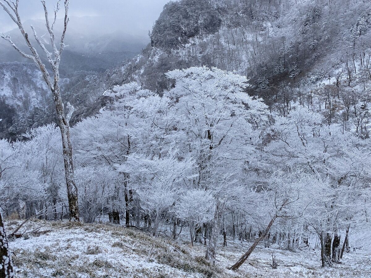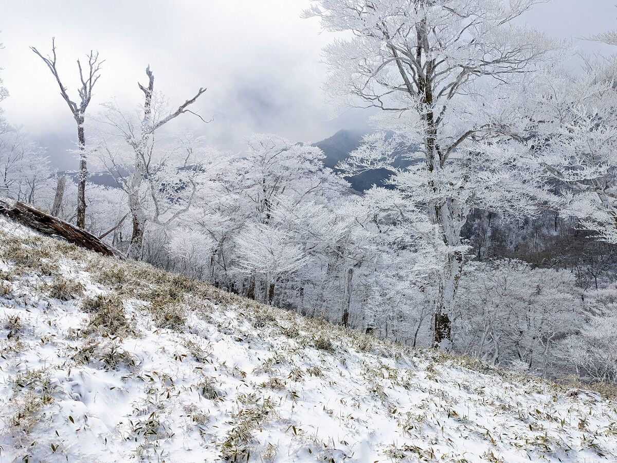さあ北岳もこの寒さでは長いは無用、中岳へ向かおう、ただこれからの鞍部の霧氷がいいもんで何度も手袋外してスマホカメラに。これがまた冷たさで長くは操作できない