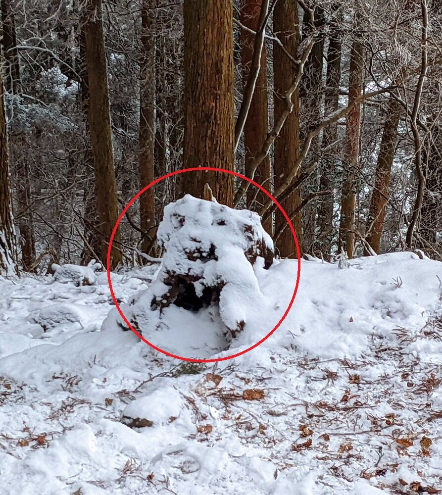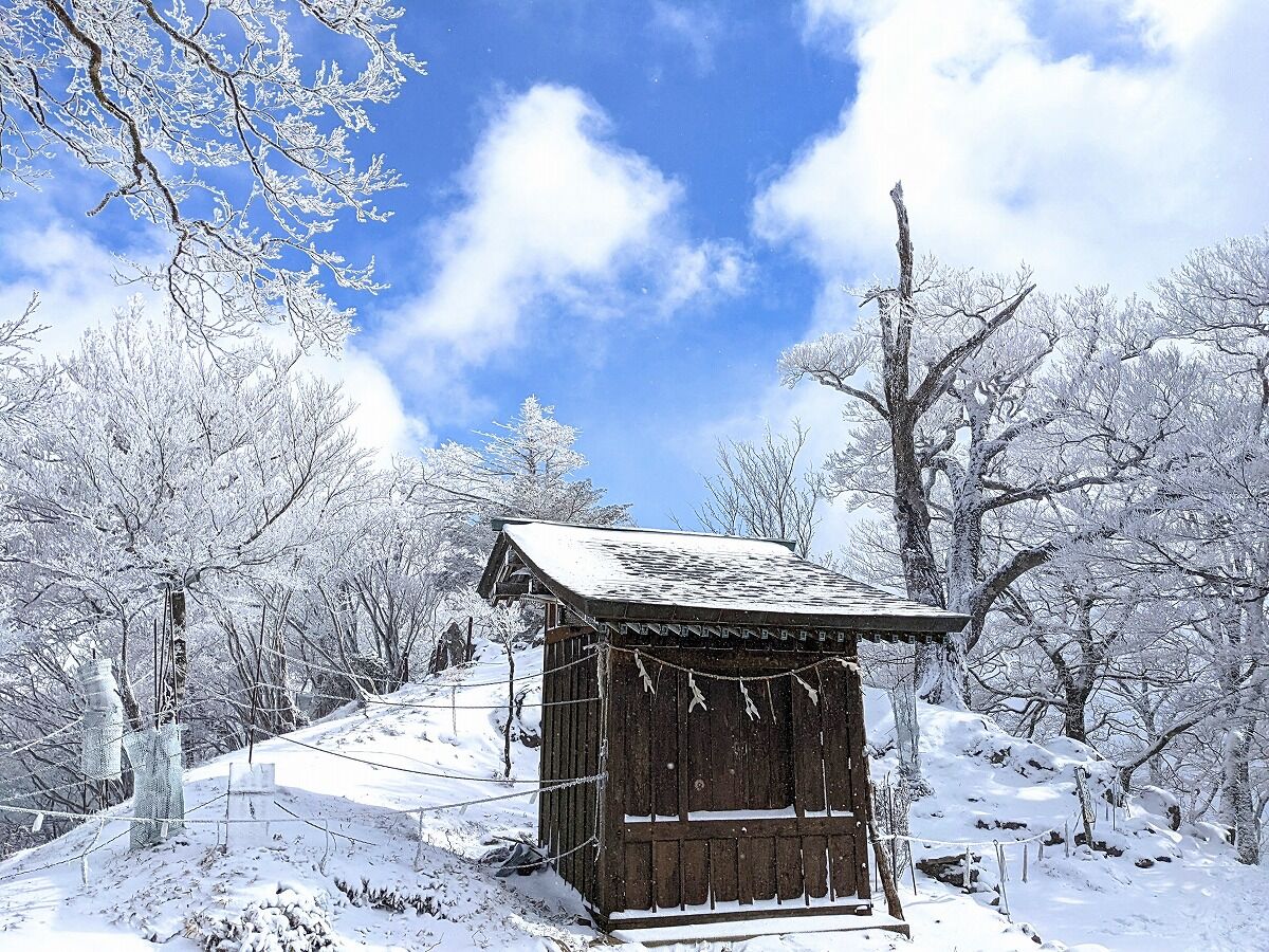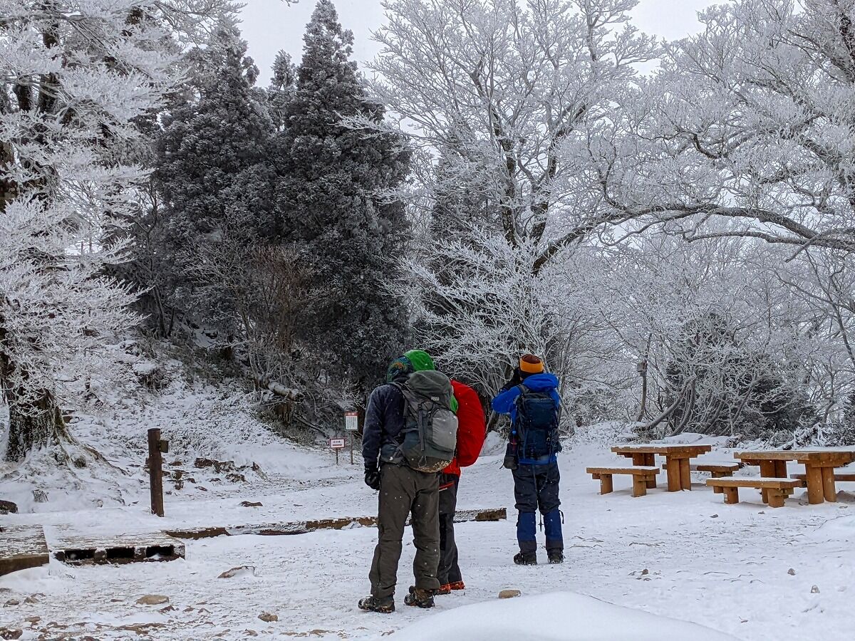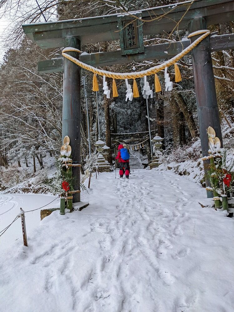 高住神社の休憩場所で旧知の山友さんと会う、山友さんグループはアイゼンを付けている、我々も安全の溜めここで アイゼン装着して入山します。