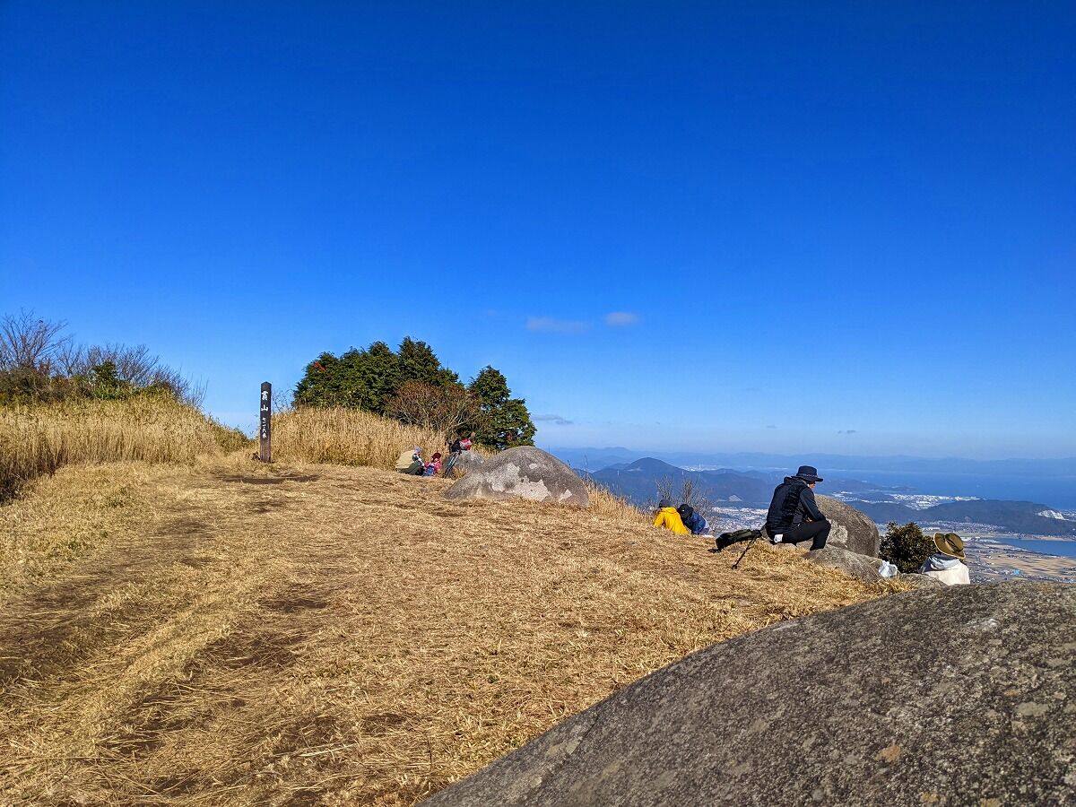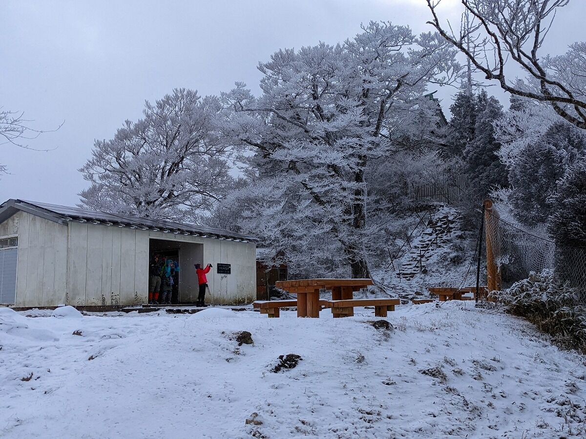 ようやく 中岳まで上がってきた、疲れた~~。が さすが今日の寒さと有ってベンチ休憩の登山者はいない、山頂小屋は満員、譲り合ってなんとかランチタイム。その間も手足がジンジンと冷たくなってきます、ランチ終えればもう下山開始しましょう。