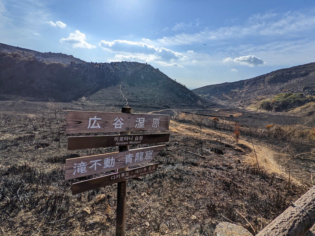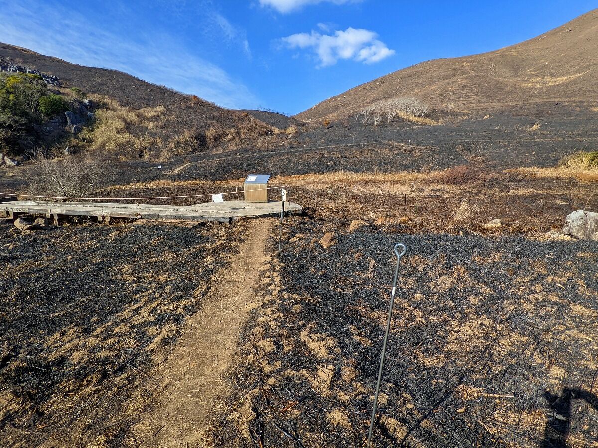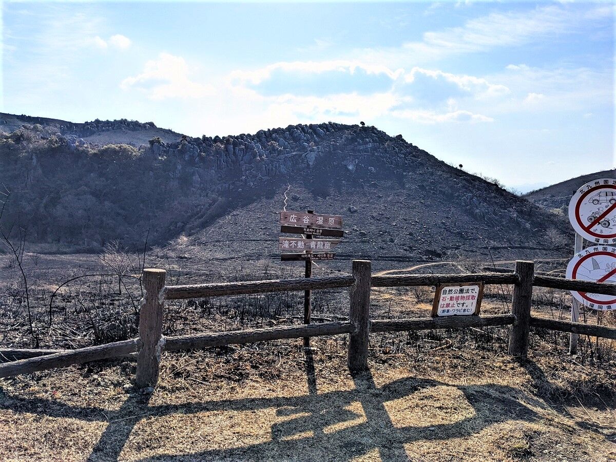 遊歩道を進み 広谷湿原を見下ろす位置まできた、ありゃ~まあ、ものの見事に完ぺきに焼き尽くされています。例年ならばここは野焼き対象区域外です。立ち入り禁止などの棚策やトラロープなどすべてが焼かれて跡形も確認できません
