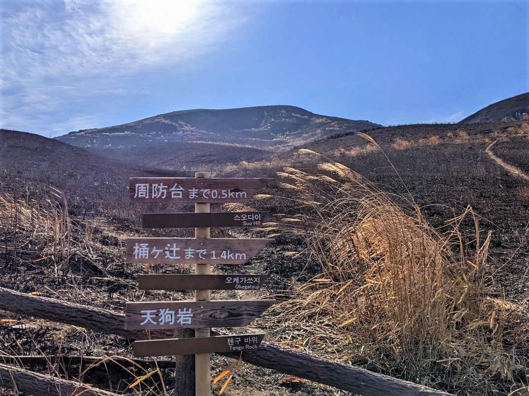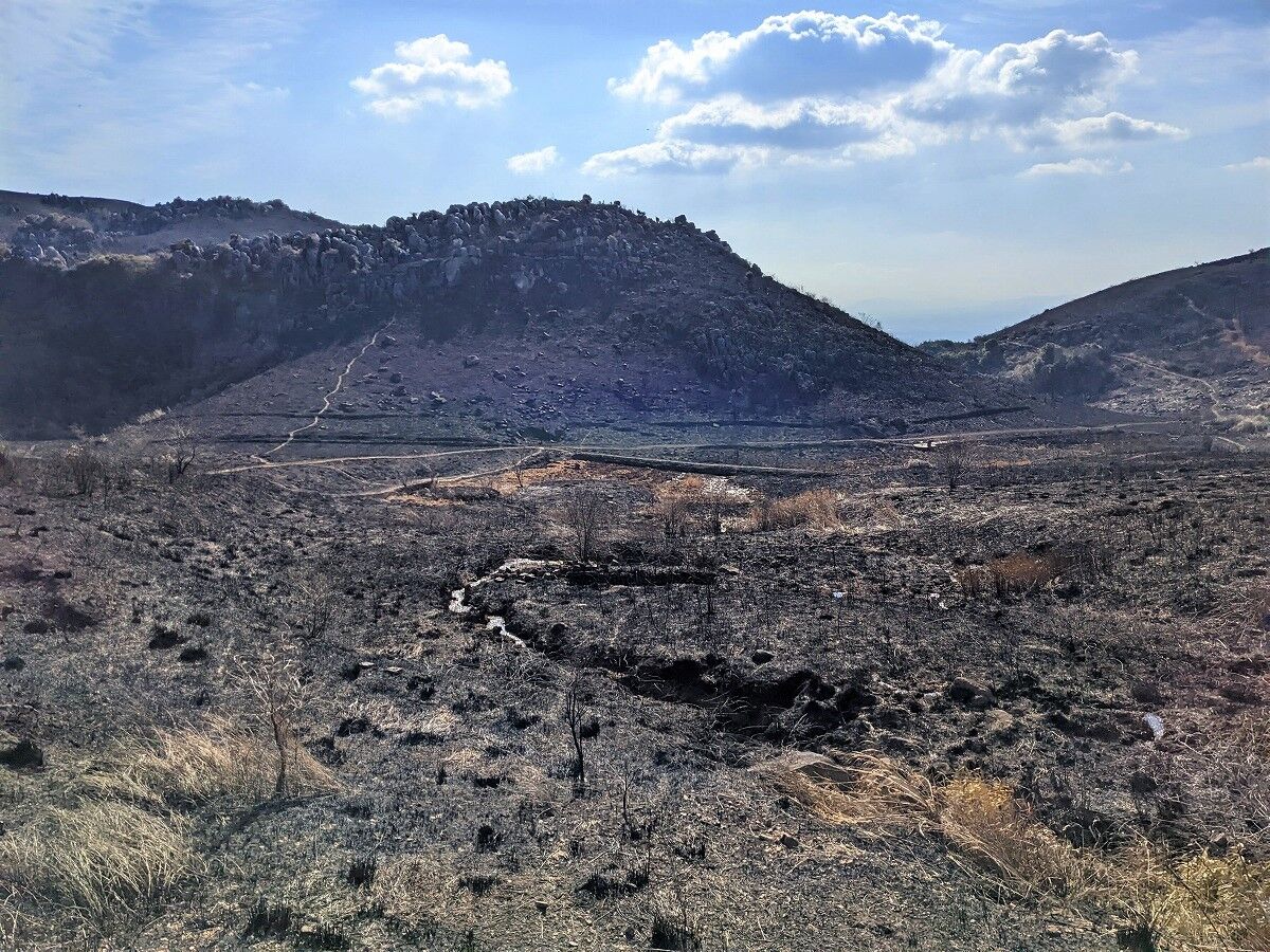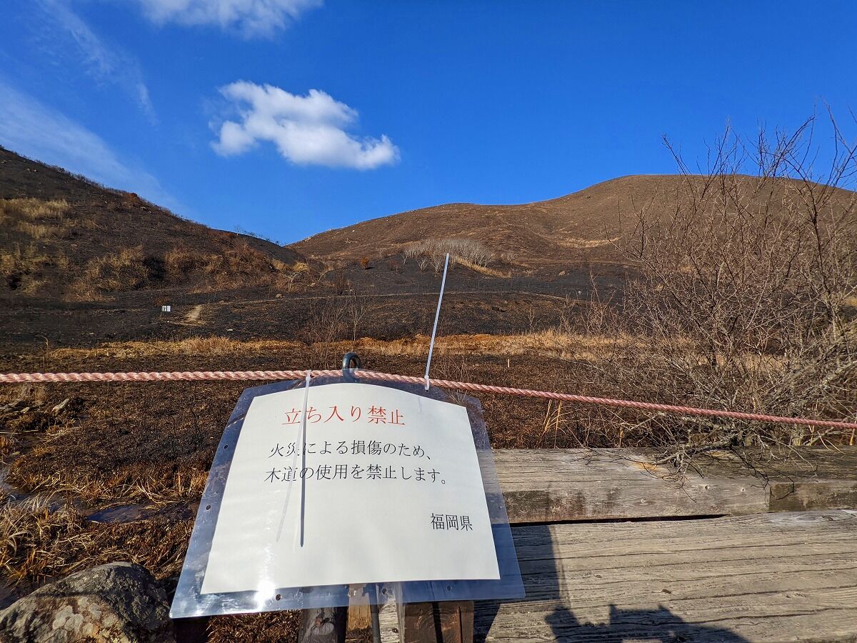 遊歩道を進み 広谷湿原を見下ろす位置まできた、ありゃ~まあ、ものの見事に完ぺきに焼き尽くされています。例年ならばここは野焼き対象区域外です。立ち入り禁止などの棚策やトラロープなどすべてが焼かれて跡形も確認できません