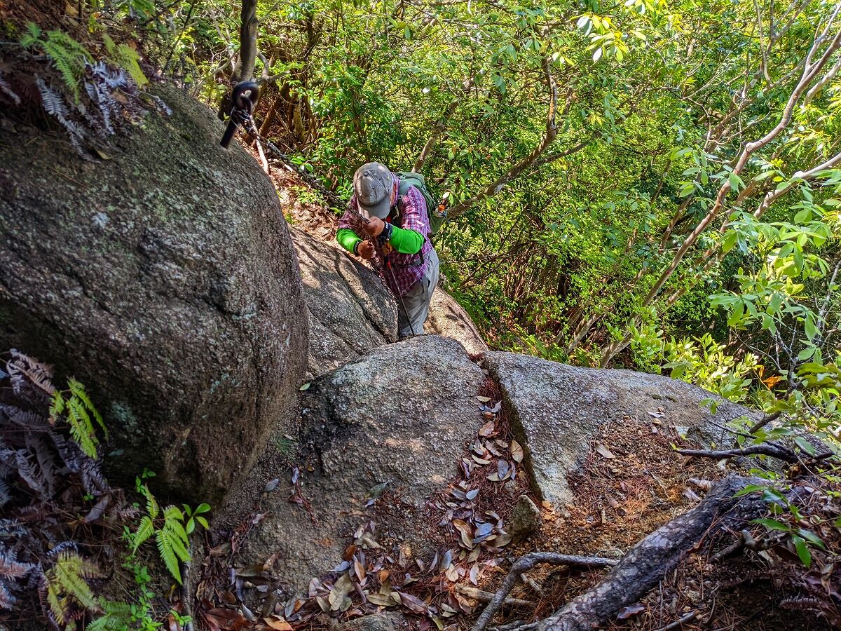さあ、先へと狭い湿った登山道を注意しながら高度上げてゆく