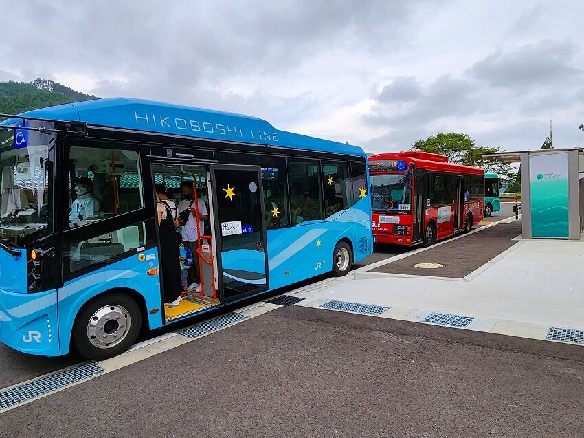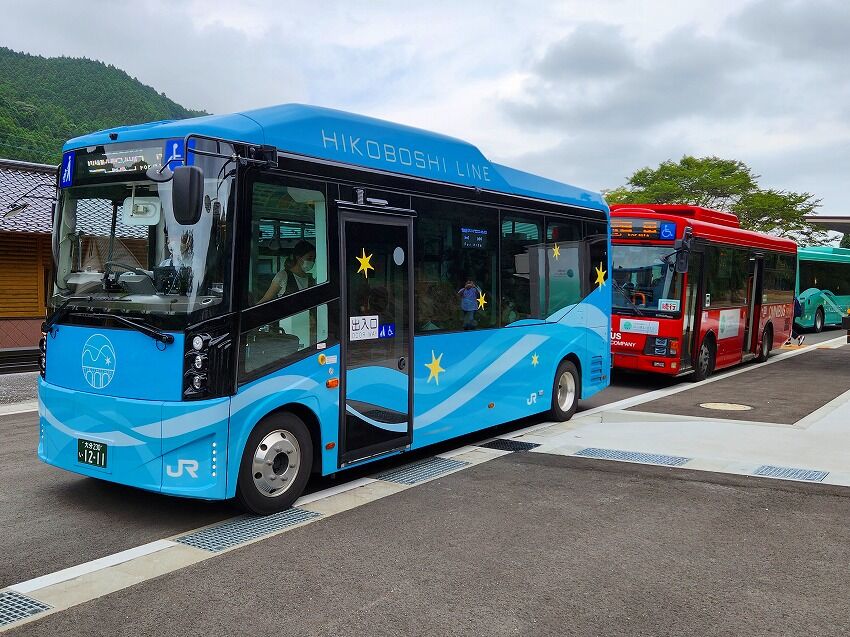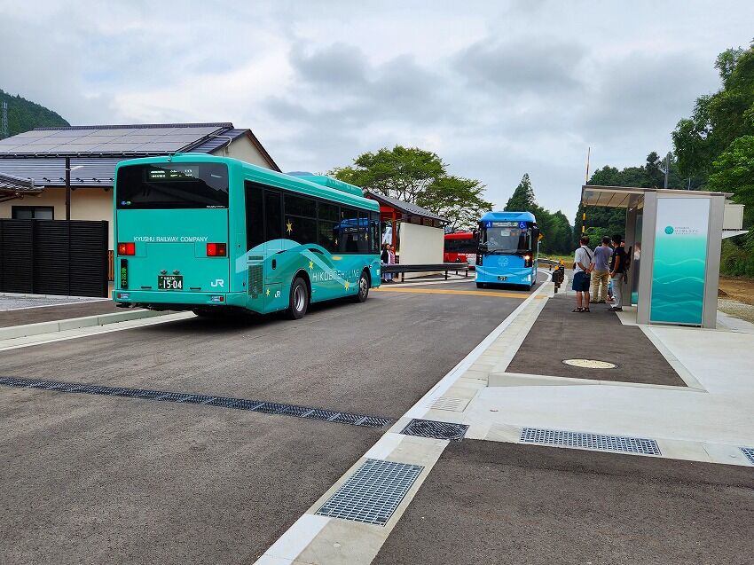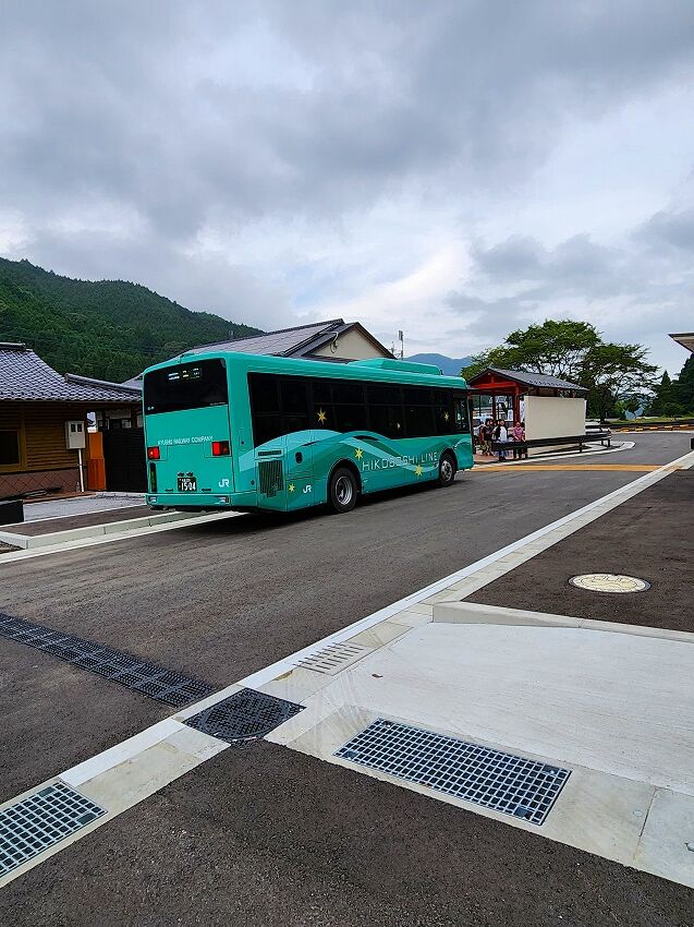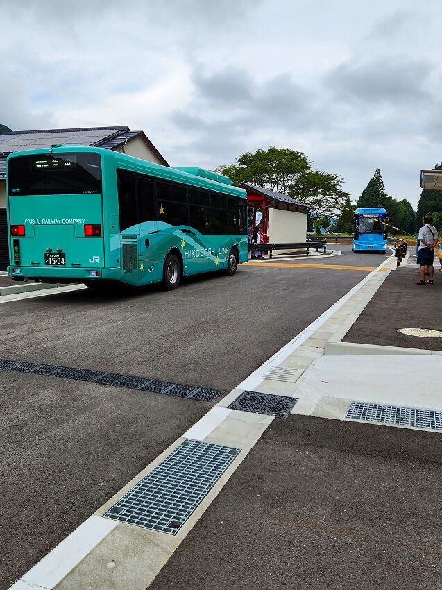 程なくして 日田方面から 新型のバスが英彦山駅にやってきます。