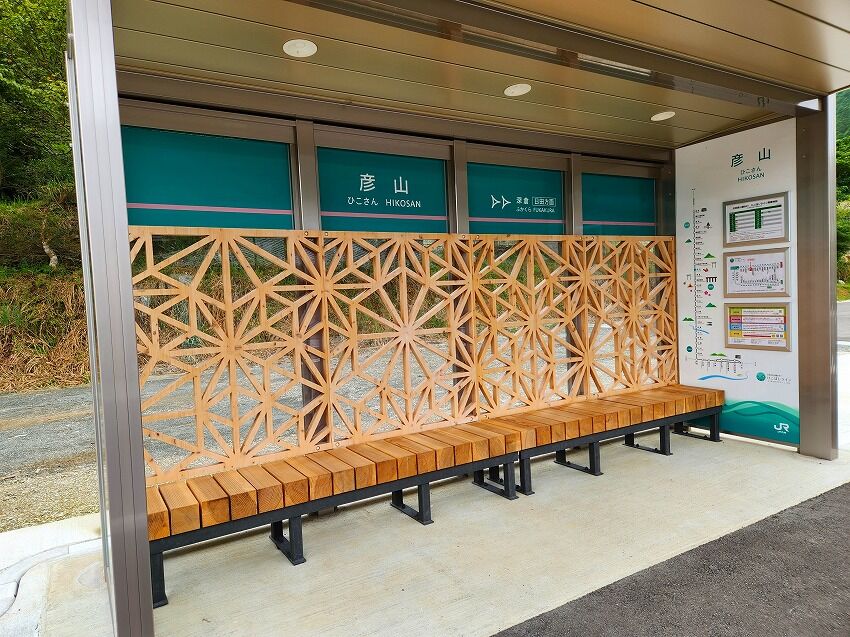 バス待合場所には地元産の木材を使った 「組子」壁材のベンチも採用されていた。