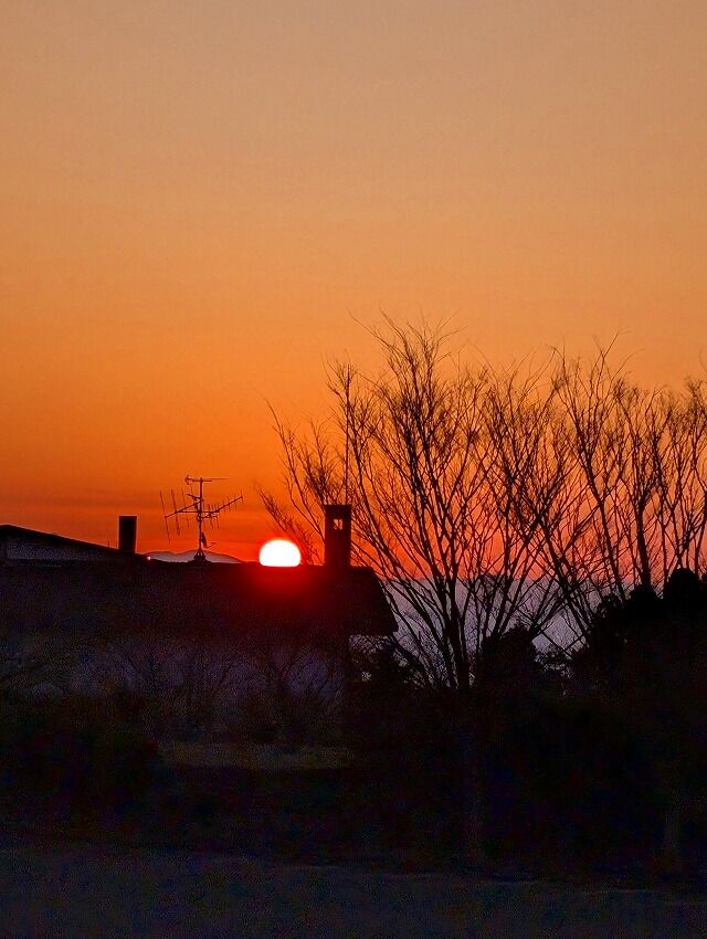 宿の前 東から真っ赤な朝陽が上がり始め 今日は絶好のウオーク日和になりそうです。