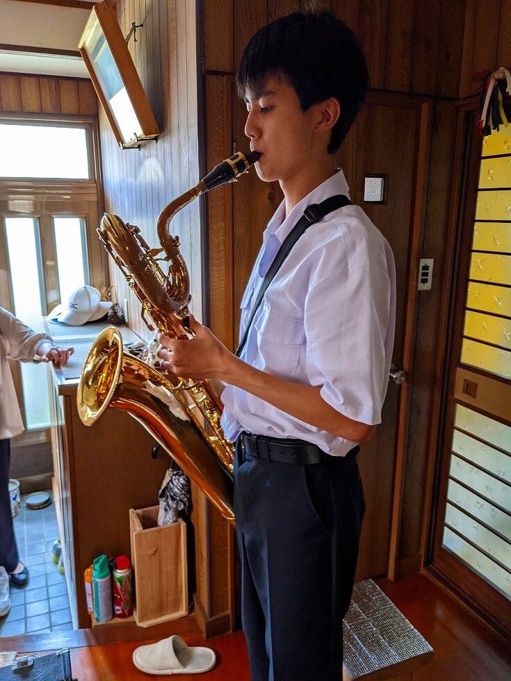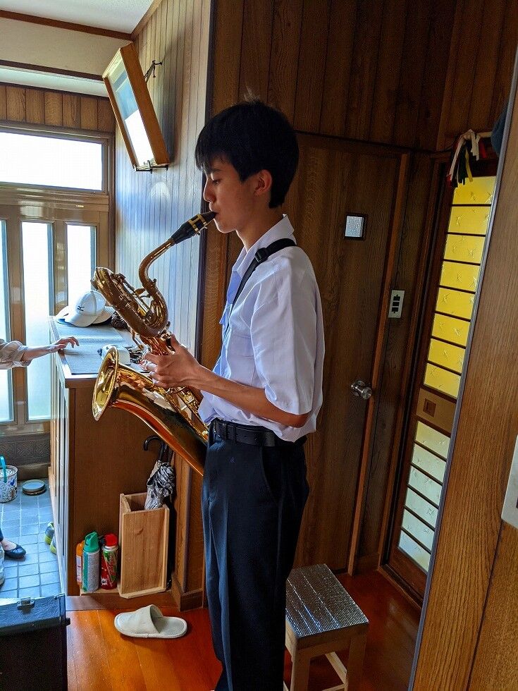 どこでどうなったかわからないけど、ともかく、演奏家が我が家にやってきました。まだまだぎこちない指先で 独特の低重音のブカブカ、ズンズンと言ったような音、まるで我が家には 場違いのような音楽がしばし響きました。やはり若い人は覚えもいいのでしょうね、コロナがなければ”区”の夏まつりなどでマーチング演奏なども有るそうなんですね。サックスも大・中・小といろいろ有るそうですね、まあ、何にしても、思い切り高校生活を元気で送ってほしいものです、もう少し上手になったら又聞かせてくれるとか、